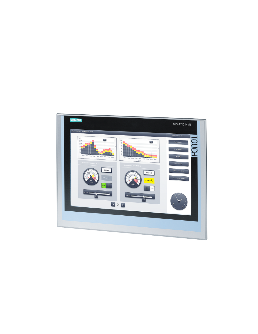 Wysoka rozdzielczość, 16 milionów kolorów i szeroki kąt widzenia do 170° zapewniają znakomitą czytelność i szczegółowy obraz procesu już z poziomu maszyny. Zmaksymalizowana żywotność wyświetlacza dzięki możliwości kontroli jasności podświetlenia LED, ekran można przyciemnić nawet o 100%, aby dostosować się do każdych warunków oświetleniowych System PROFIenergy stale kontroluje napięcie we wszystkich komponentach automatyki, dzięki integracji z istniejącymi standardami zapewnia najlepszą ochronę inwestycji.