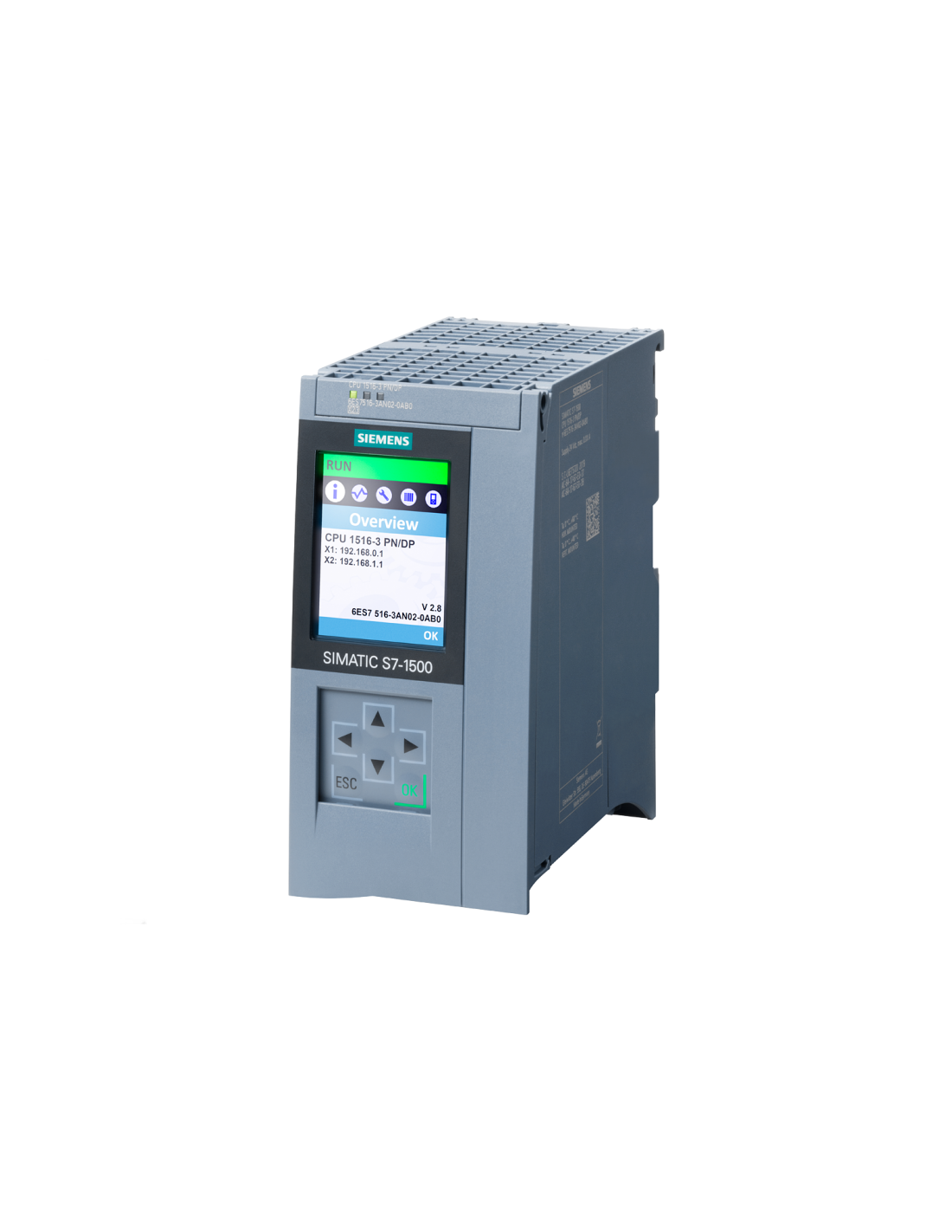 SIEMENS SIMATIC S7-1500 CPU 1516-3 PN/DP - 6ES7516-3AN02-0AB0, jednostka centralna z pamięcią roboczą 1 MB na program i 5 MB na dane, 1. interfejs: PROFINET IRT z przełącznikiem 2-portowym, 2. interfejs: PROFINET RT, 3. interfejs: PROFIBUS, wydajność 10 ns bitów, wymagana karta pamięci SIMATIC.