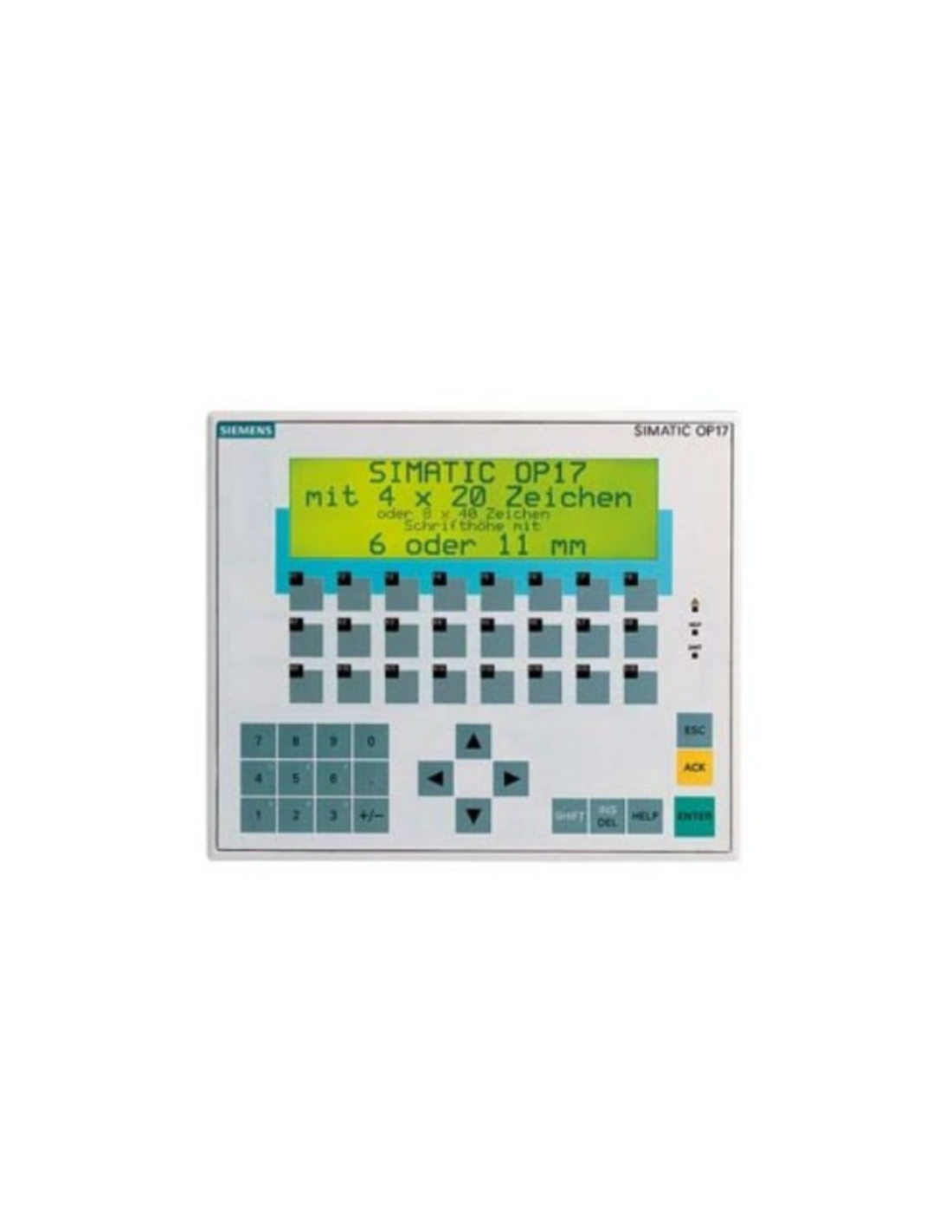 Panel operatorski z wyświetlaczem LC z podświetleniem LED Siemens SIMATIC HMI OP 17/DP - 6AV3617-1JC20-0AX1, przeznaczony do obsługi i wizualizacji w systemach SIMATIC S7 oraz M7. Urządzenie wyposażone w ekran monochromatyczny, liniowy, pracujący w układzie 4 × 20 / 8 × 40 znaków, oraz klawiaturę membranową z obsługą przez klawisze. Do obsługi panelu zastosowano 24 programowalne klawisze funkcyjne, z czego 16 ma diody LED, klawisze membranowe mogą być indywidualnie opisywane. Panel obsługuje wprowadzanie numeryczne, ma klawiaturę szesnastkową i nie obsługuje jednoczesnego naciskania wielu klawiszy.